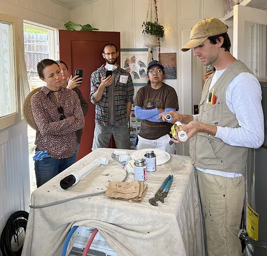 Inside the laundry room, people listened and filmed intently as Greywater Corps installer Justin Lucas explained how we would be plumbing the pipes to get greywater from the washing machine to the front yard. Volunteers tried their hand at working with PVC while Justin demonstrated how to make perforations in the wall and floor to run the pipe into the crawlspace below. After workshopping how to configure the pipes, Justin guided attendees through the assembly and mounting of the plumbing.