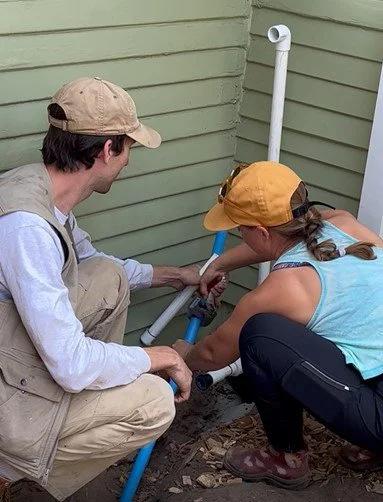 After the digging was done we started laying out and cutting the tubing. With everyone’s help the irrigation system was coming together before our eyes. Soon enough it was time to connect to the plumbing. A small but dedicated group had gone under the house to build the plumbing from the laundry room to the front. Most of this work was completed by installer Clay Mosman, the real MVP of the day, and culminated in a 1” PVC outlet in front of the house that we connected to our irrigation network.